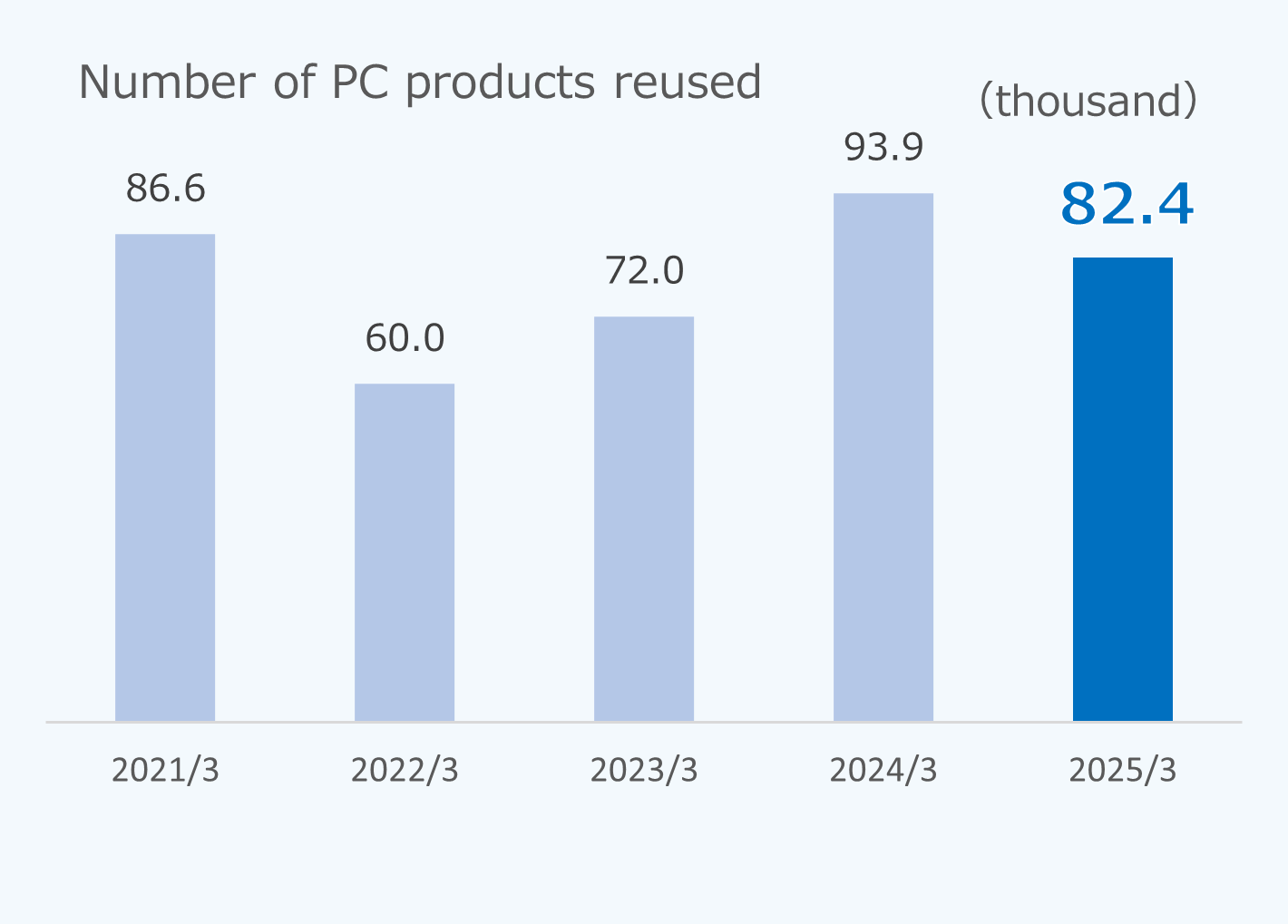 The Kaga Electronics Group company KAGA MICRO SOLUTION CO., LTD. has flexibly changed and expanded its business domain to meet a wide range of customer demands, from the development, production and sale of electronic products to their repair, maintenance, reuse and recycling. The company has leveraged know-how in the production of electronic equipment and an extensive procurement route for electronic parts and materials—both of which were accumulated in the EMS business, a strength of the Group—to focus on a reuse and recycling business for PC products in recent years. In addition to “reduce programs” that look especially at cutting CO2 and rubbish levels, the Group will contribute to a reduction in environmental burden from a reuse and recycling perspective and to the realization of a recycling-oriented society.