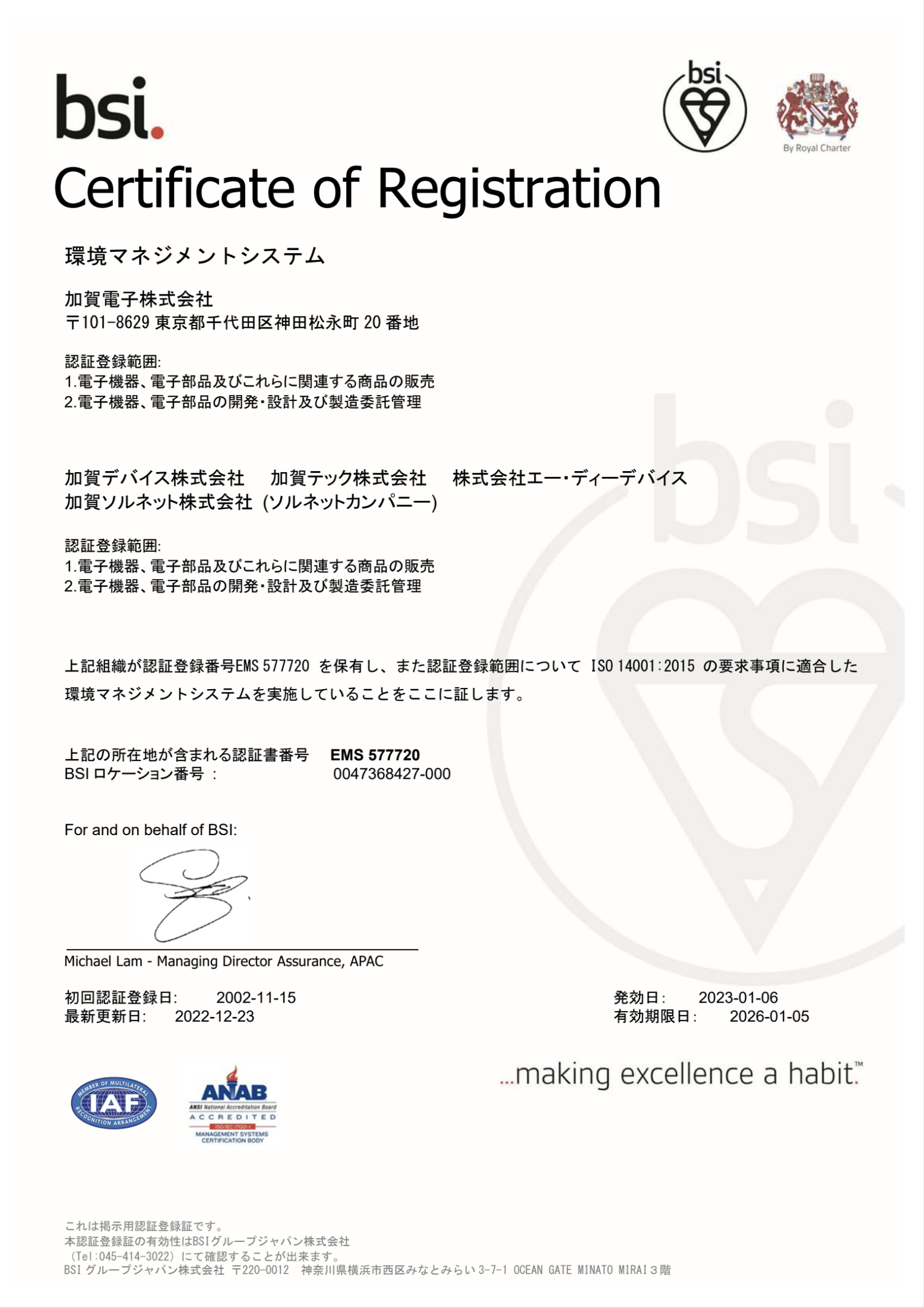 KAGA ELECTRONICS and the following Group companies have attained ISO 14000 series certification, an international standard for environmental management.