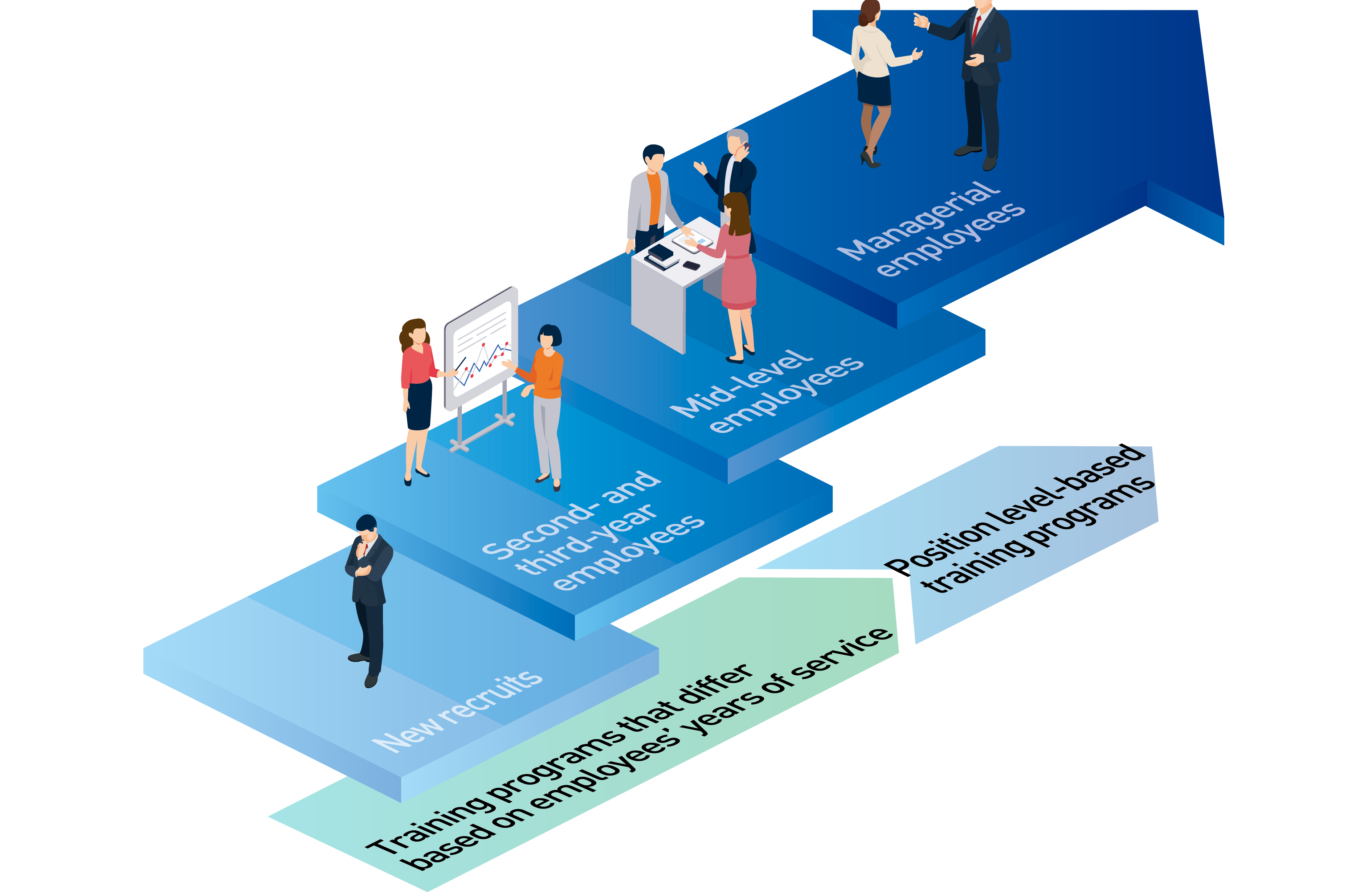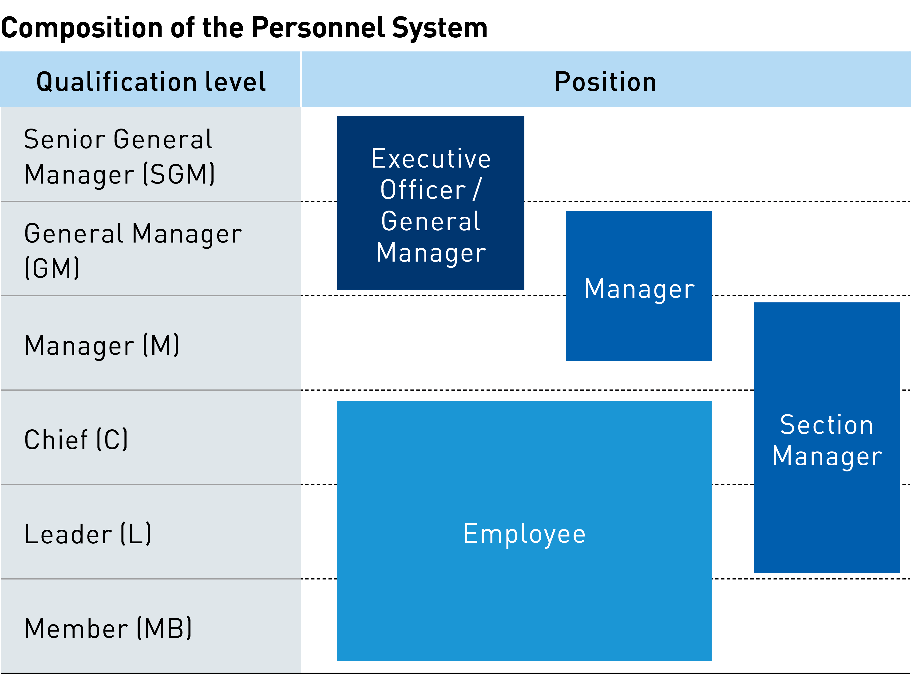 The Kaga Electronics Group’s approach to human resources can be summarized into a single sentence, “People are our greatest asset.” In line with this approach, we have worked to nurture independent, autonomous, and self-motivated individuals with a strong spirit. In the course of human resource management, we remain mindful of what can be done to maximize the value of our human resources and bring out their full potential while encouraging them to exercise their unique strengths as Kaga Electronics Group employees. At the core of our training system are in-house position level qualification systems and training programs that differ based on employees’ years of service. The former grants membership to each employee upon joining the Group and, as they accumulate experience, promotes them to leader, chief, manager, general manager and, ultimately, senior general manager. These titles, however, do not necessarily reflect job functions. For example, an individual at the “leader” rank could be appointed to a manager position if deemed to possess management skills. Likewise, a general manager can be appointed from among individuals who have only reached the “manager” level.