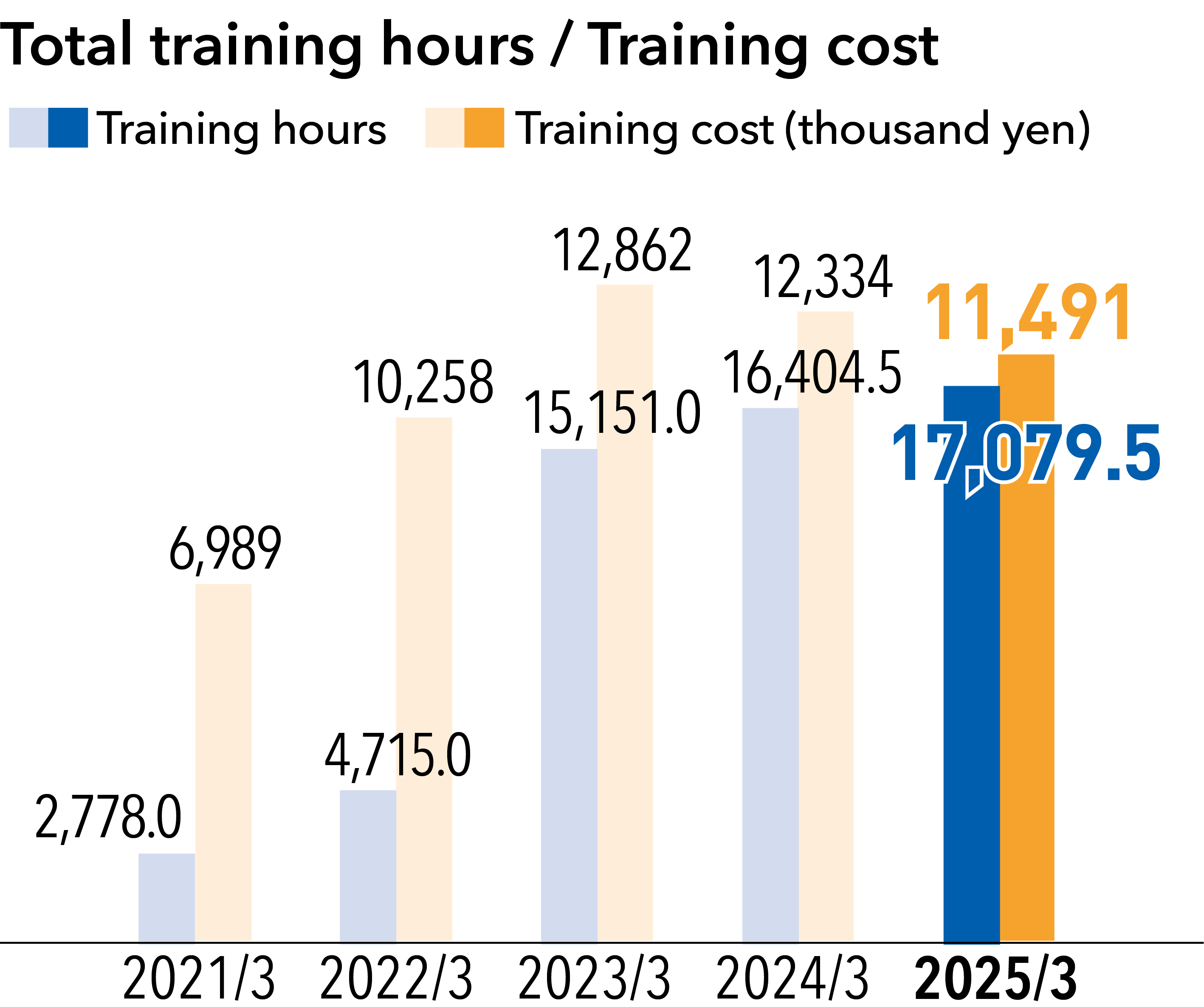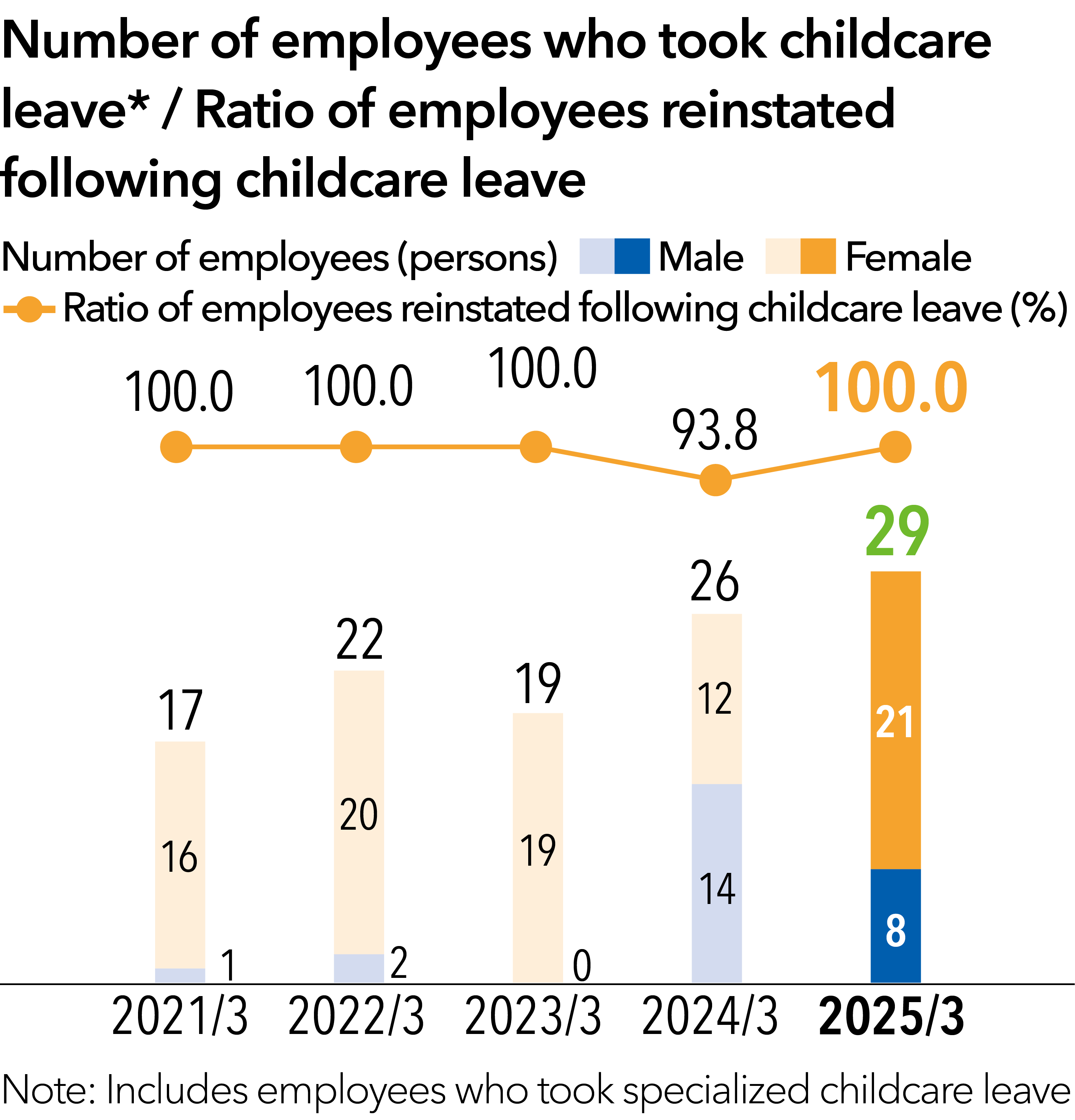 At the Kaga Electronics Group, we support the career development of employees through training for new recruits, annual training, rank-based training, e-learning, and other forms of education, as well as by providing assistance through correspondence courses. At the core of our training system are in-house position level qualification systems and annual training programs. Under this system, every new employee receives training to qualify as a Group member before advancing to leader, chief, manager, general manager and, ultimately, senior general manager. Our training programs, which differ based on employees’ years of service, provide comprehensive support, including post-employment training for new hires, sales mindset training, factory tours (manufacturing training), six-month follow-up training, and basic technical study sessions. Over their second to fifth year, employees undergo training on a yearly basis. Around their sixth year, employees typically reach the “leader” level of positions, making them eligible to participate in such position level-based training programs as leadership training. In addition, every year, we grant a total of six days of paid “refresh leave,” which is separate from annual paid leave, to all employees. We also instituted a sick leave program for those who develop one of three specified types of serious disease (cancer, cerebral stroke, or myocardial infarction) to help them secure their income during their hospitalization and absence from work as well as hourly paid leave. Furthermore, to encourage male employees to utilize childcare leave, we implement various initiatives—including a specialized childcare leave system that was established on April 1, 2023. Through such initiatives, we aim to strike a good work-life balance and thus realize a safer work environment for employees.