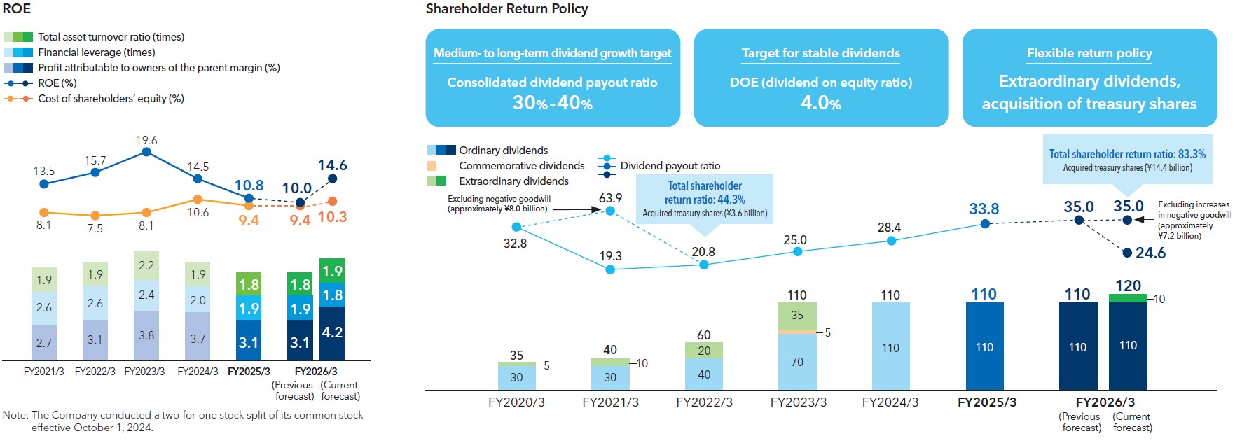 Following the dividend increase revision, DOE is projected to be 4.2%. With this share buyback and cancellation, ROE for the fiscal year ending March 2026 is expected to reach 14.6%, and the total dividend payout ratio is projected to be 83.3%. The stock market has responded favorably to the Company’s initiatives, with PBR exceeding 1.1 times (as of September 30, 2026).