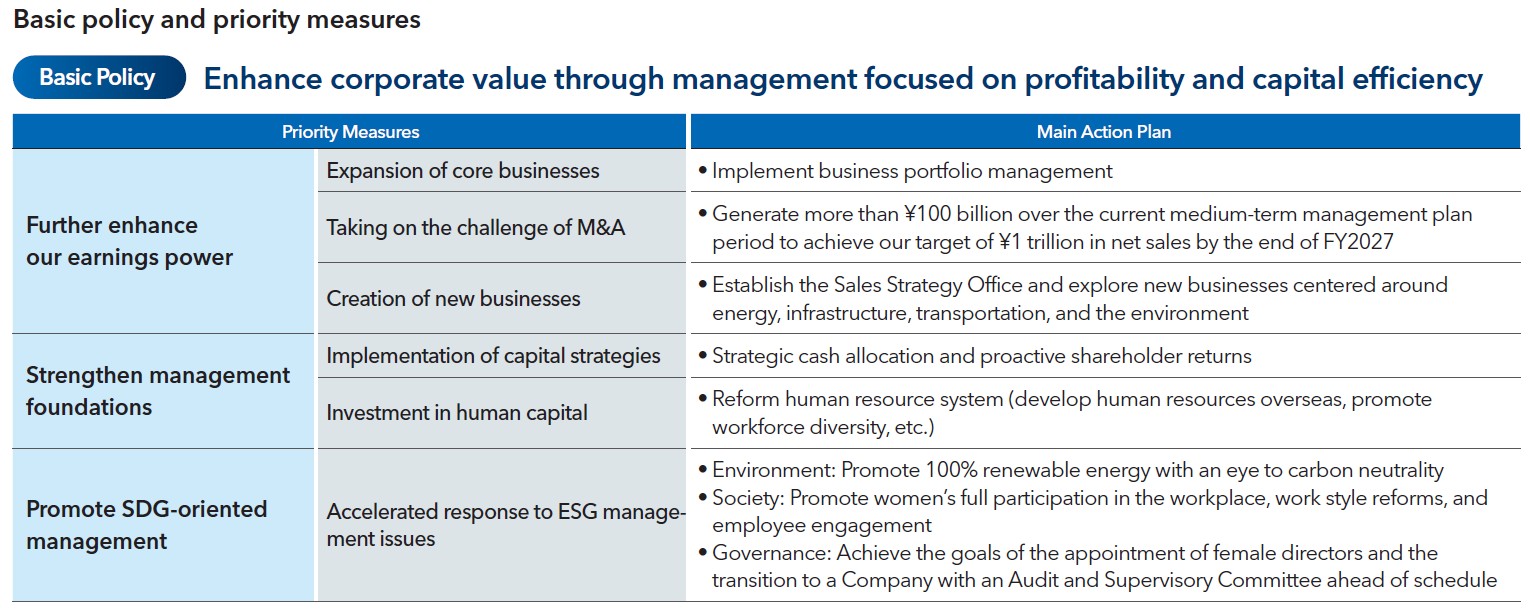 Medium-Term Management Plan 2027 identifies further enhancing our earnings power through the expansion of our core businesses as a priority measure and the implementation of business portfolio management as an action plan.