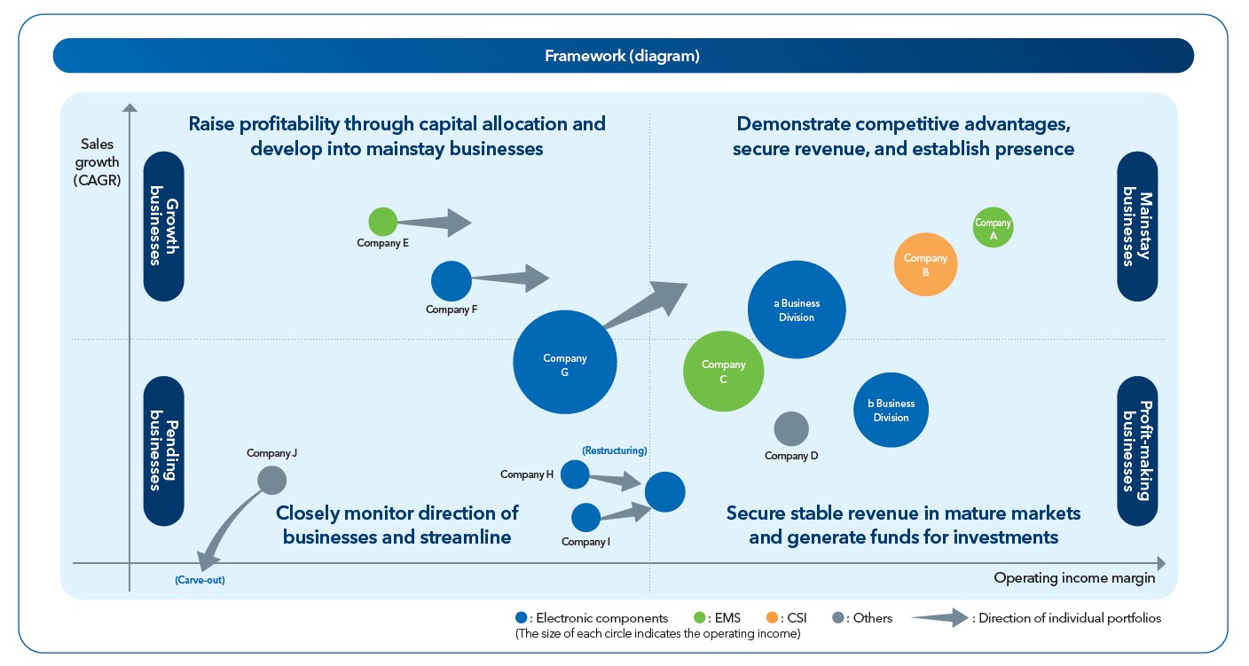 As an organization within the Kaga Electronics Group, Kaga Electronics analyzes the medium-to-long-term direction of each of its businesses by Visualizing them on a Framework with sales growth potential on the vertical axis and operating income margin on the horizontal axis. This analysis is conducted at the business division level for Kaga Electronics and at the individual company level for Group companies and used to inform investment policies and budget/performance management. While each company previously operated under independent managements, the increase in Group companies through M&A has led to a shift toward managing and allocating management resources with an eye to an overall optimization.