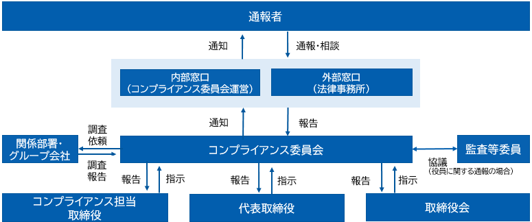 また、救済措置として、法令および定款違反の行為に関する社内通報システムを設置し、代表取締役 会長執行役員・代表取締役 社長執行役員・監査役、およびサステナビリティ委員会、セクハラ調査担当対策委員に対して、他者を介在することなく、かつ匿名で通報することのできる体制を構築しております。