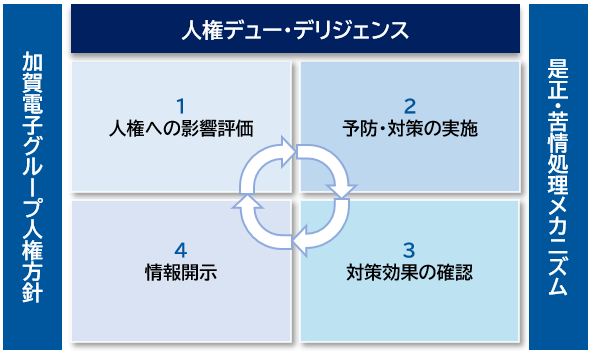 加賀電子および当社グループの事業活動により、人権に負の影響を引き起こしたり助長したりすることが明らかになった場合には、適切な手段を通じてその是正に取り組みます。