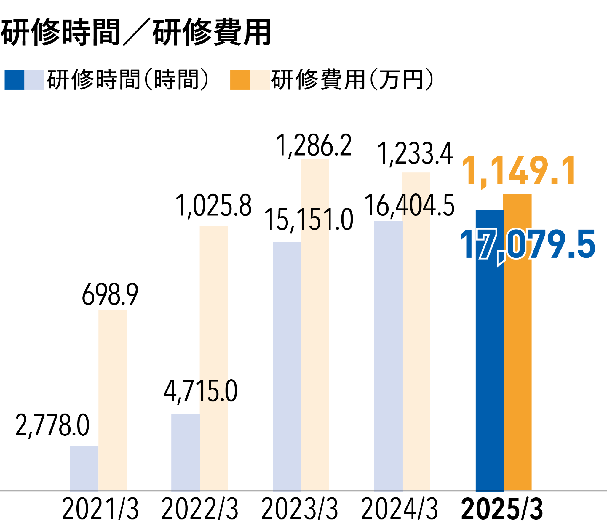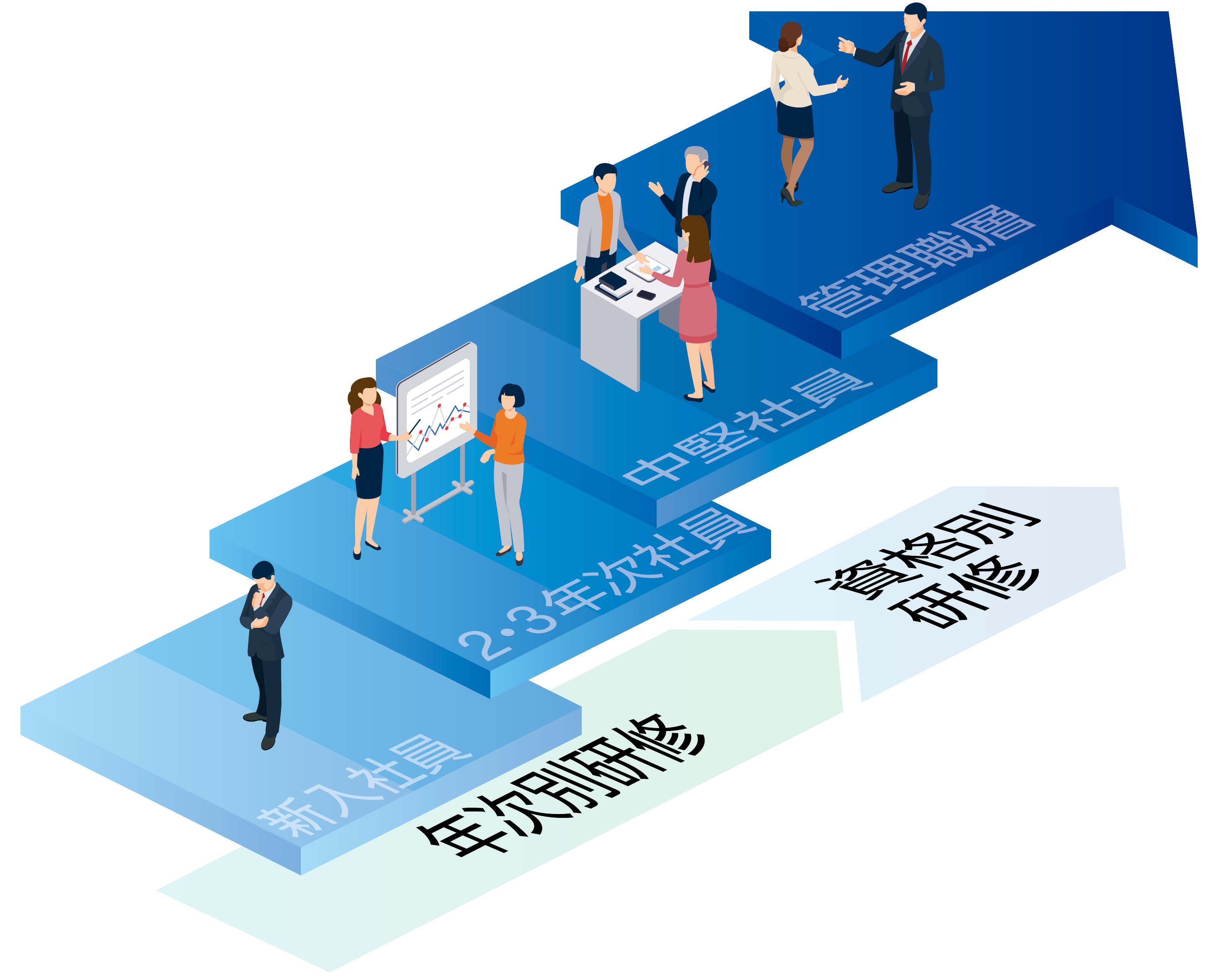 当社グループでは、新人研修や年次研修、階層別研修などの実施や、通信教育講座受講の補助などを通じ、従業員のキャリア形成を支援しています。