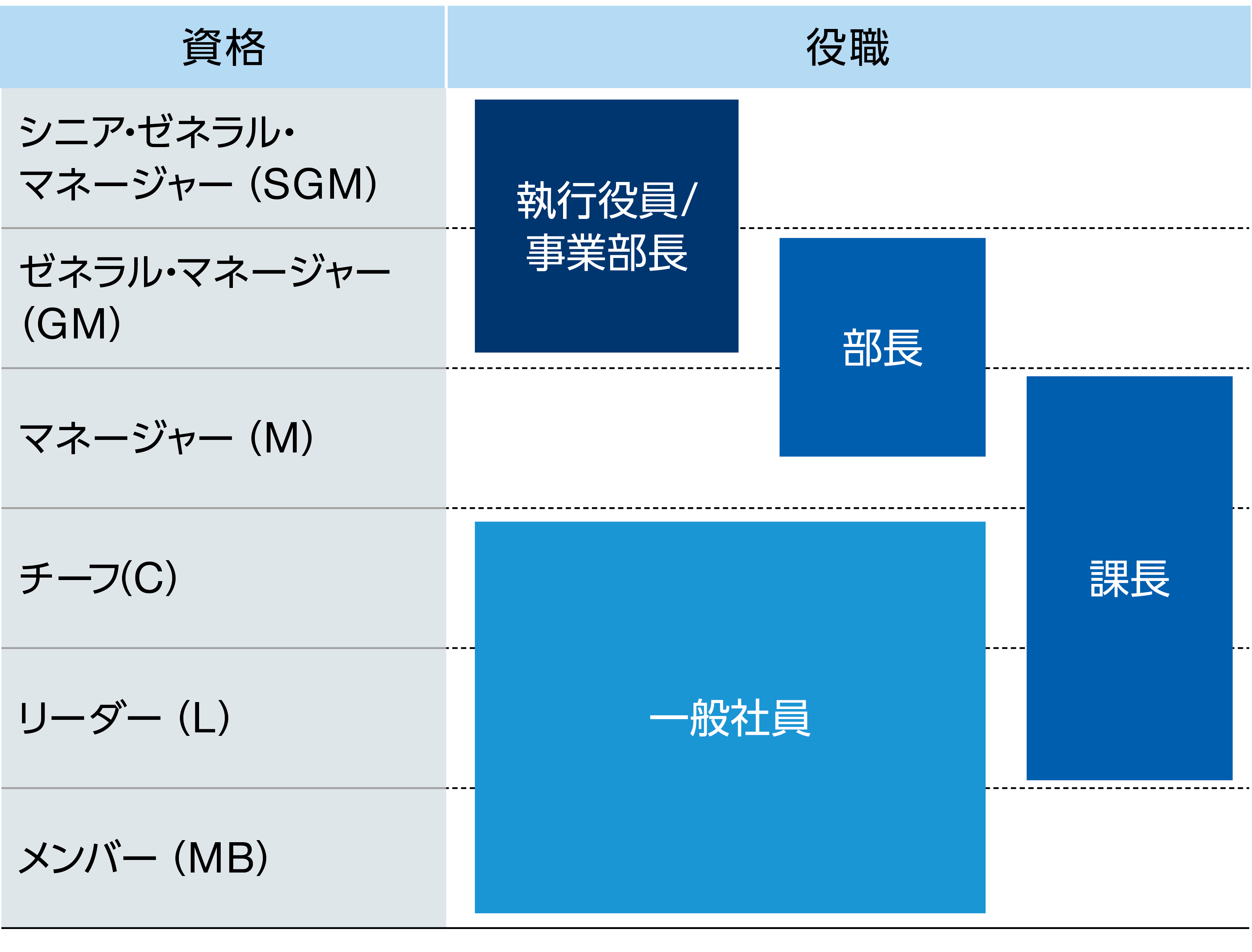 当社グループは、育成制度の中心が、資格制度と年次別研修です。資格制度では、入社するとメンバーの資格が与えられ、以降、リーダー、チーフ、マネージャー、ジェネラルマネージャー、さらにシニアジェネルマネージャーと昇格しています。この資格と役職とは分離しており、リーダーでもマネジメントの資質が認められれば課長に、マネージャーでも部長に起用されます。