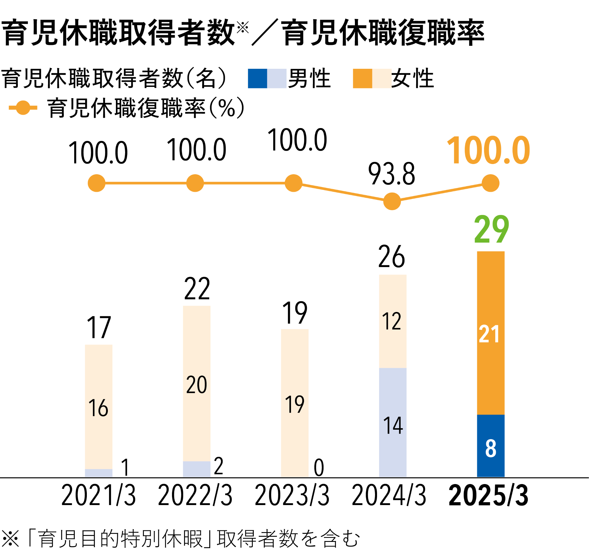 また、全従業員には有給休暇制度とは別に「リフレッシュ休暇」を毎年6日付与するとともに、時間単位の有給休暇制度も導入しています。さらに、男性の育休取得率を促進する観点から、2023年4月1日より「育児目的特別休暇」を新設するなどさまざまな取り組みです。
