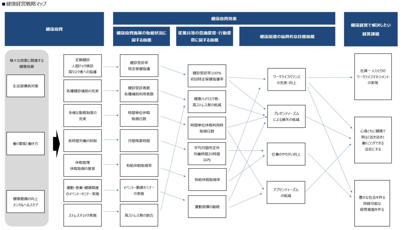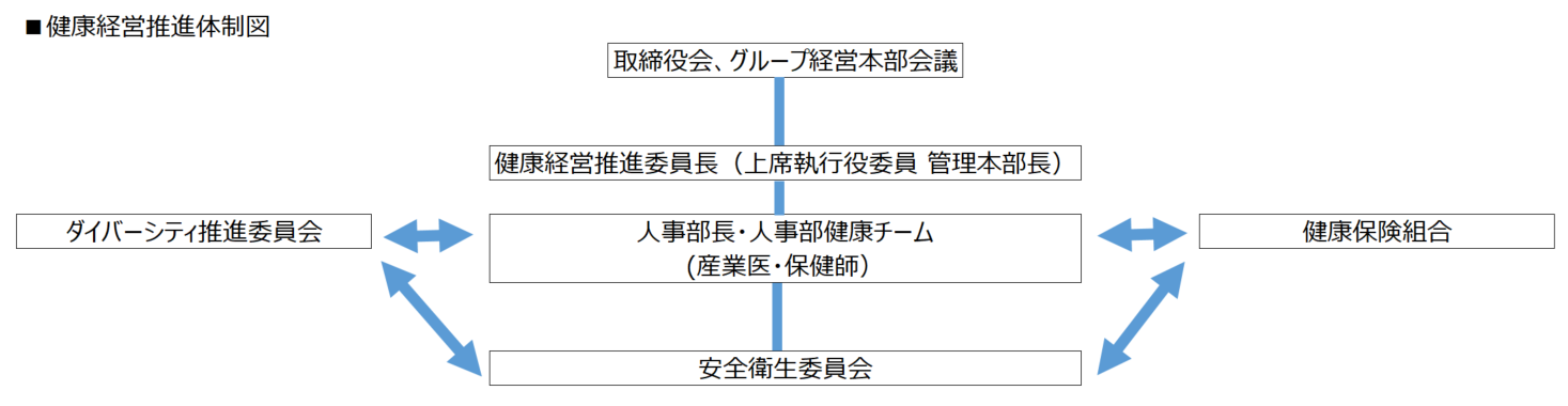 また、企業の持続的な成長には、風通しの良い職場、働きがい、従業員と家族の健康などを基盤とした活力のある企業風土が極めて重要であり、その健康を維持向上し続けることで私たちの存在価値が高められると考えています。
