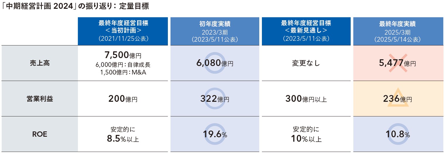 しかしながら、当時想定できなかった在庫調整の長期化や賃上げなどの影響もあり、計画最終年度となる2025年3月期は、売上高、営業利益ともに、この「最新見通し」に届きませんでした。ただし、ROEは、中計期間中、安定的に10%以上を確保しました。