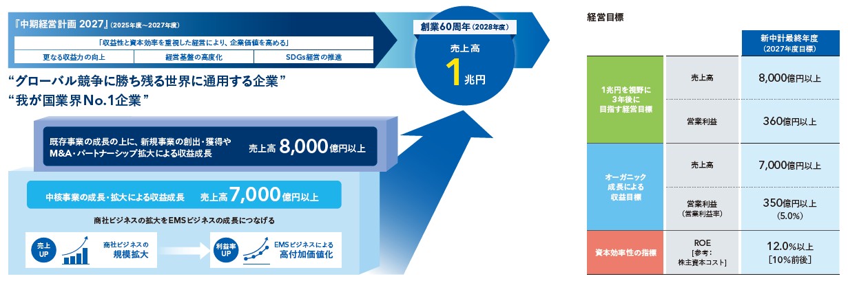 2028年度の「売上高1兆円」を見据えて、計画最終年度となる2027年度の経営目標は「売上高8,000億円以上」、「営業利益360億円以上」としました。このうち、オーガニック成長による目標は、「売上高7,000億円以上」「営業利益350億円以上」と置き、「営業利益率5.0%以上」は確保したいと考えています。