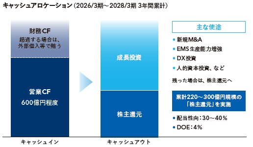 具体的には、計画期間中の3ヵ年で稼ぐ営業キャッシュ・フローを600億円程度と見込み、そのうち株主還元には220億円から300億円程度を、新規M&AやEMS事業における生産能力増強など成長投資には300億円超を目安に配分していきます。