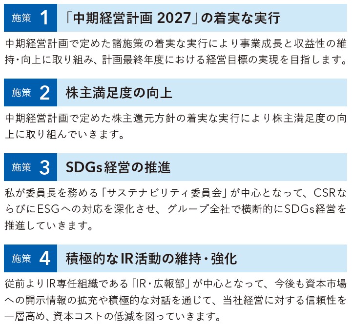 当社は、PBRの改善に向けて、株主資本コストを上回る水準にROEを維持・向上させるとともに、当社の事業の取り組みや成長戦略に対して株式市場の皆様から正当なご評価をいただけるよう、「中期経営計画2027」にて策定した諸施策の着実な実行を始めとする、以下の四つの取り組みに注力してまいります。そして、これからも積極的なIR活動を通じて、市場関係者の皆様との建設的な対話に努めてまいります。