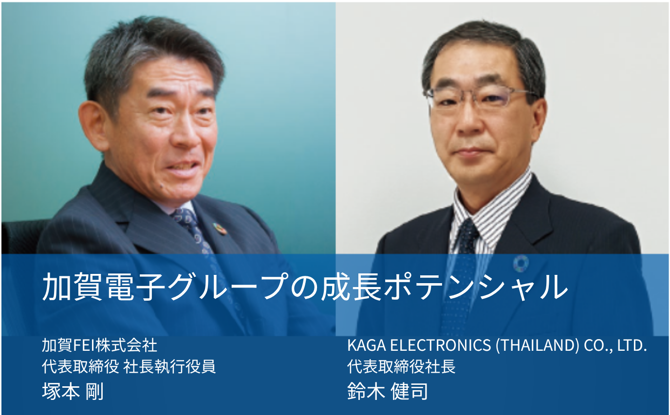 加賀FEI株式会社社長の塚本 剛と、KAGA ELECTRONICS( THAILAND) CO., LTD.社長の鈴木 健司(前・加賀EMS十和田株式会社社長)に、加賀電子グループならではのPMI※ をどのように進めていったのか、EMS事業の今後の展開をどのように考えているかを聞きました。