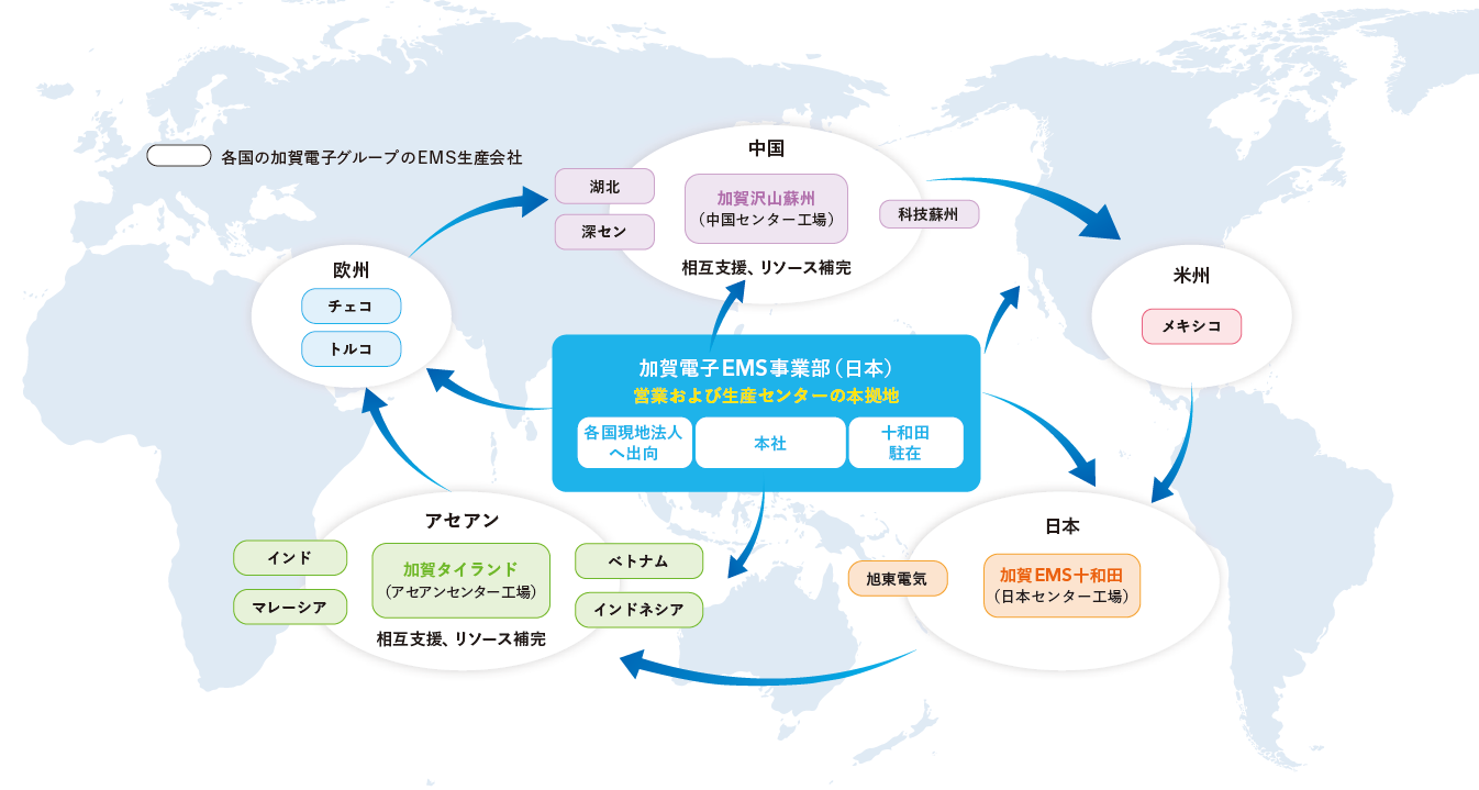 加賀電子グループのEMS事業はもともと、日本の製造業の海外シフトを支援する目的でスタートしましたから、製造拠点は海外が主体です。それが5年ほど前から、国際情勢、特に地政学的問題から国内製造回帰の動きが始まり、加賀電子も国内に製造拠点が必要となって、2019年10月の十和田買収に至ります。したがって、加賀電子のEMS事業のグローバルな工場ネットワークの中では、十和田が最後発なのです。
