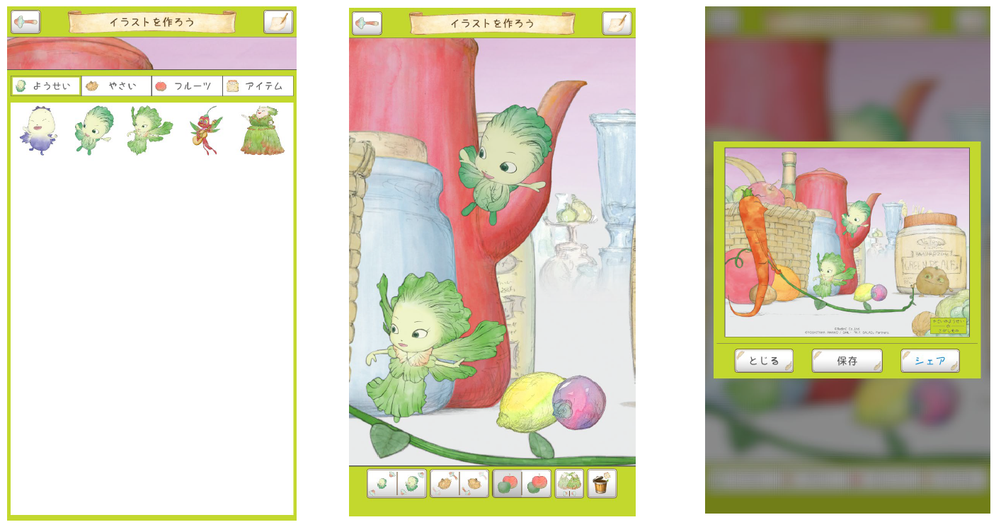上記にてコレクションした妖精やアイテムと背景を自由に配置して、オリジナルのイラストを作成・保存・共有できます。